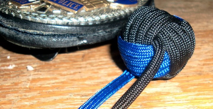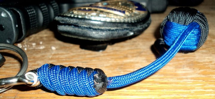 So, in the giveaway, I won a piece of gear Bama calls “The World’s Most Dangerous Zipper Pull.” Think of it as a scaled down monkey fist, like a vicious Pomeranian compared to a pit bull. I was uber-excited and took the opportunity to also order a standard bracelet when I messaged Bama about the zipper pull. In the email, I stated I was thinking about using the pull as a keychain. I asked if both could be made in the Think Blue Line color scheme. Bama replied, saying he hadn’t made the zipper pull in two colors, but since I was planning on using it as a keychain, he’d go ahead and upgrade it to a standard monkey fist: “If I’m going to be doing a prize giveaway anyhow I’d much rather give a man something he can really USE than something he can just find a use FOR. If you know you’ll be using it on your keys I really think you’ll be happier with the full size. I can do that. It’s my company!”