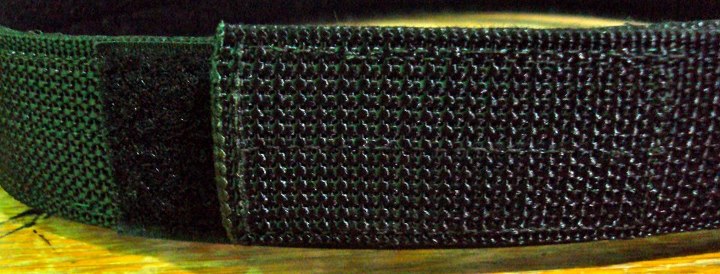 I then unrolled the belt and held it several inches from the buckle.  The only word to describe the image was erect.  My Uncle Mike’s belt looks flaccid in comparison–really, check out the pictures.  I then put on the belt; threading it through my jeans’ belt loops proved very easy, once I remembered to thread both the tail and the start of the double-layer of webbing through each loop.  Threading the belt through my Eclipse holster was also easy–there was enough friction to keep the holster from shifting, but not so much that I needed a clamp and winch to pull the belt through the loops.