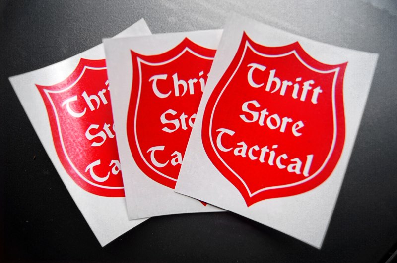 But wait, there’s more–three other TSTers will win a TST decal, custom made for me by my friend at Tactical Vinyl. Yes, they look like the Salvation Army logo–they’re supposed to. Thrift Store, get it?